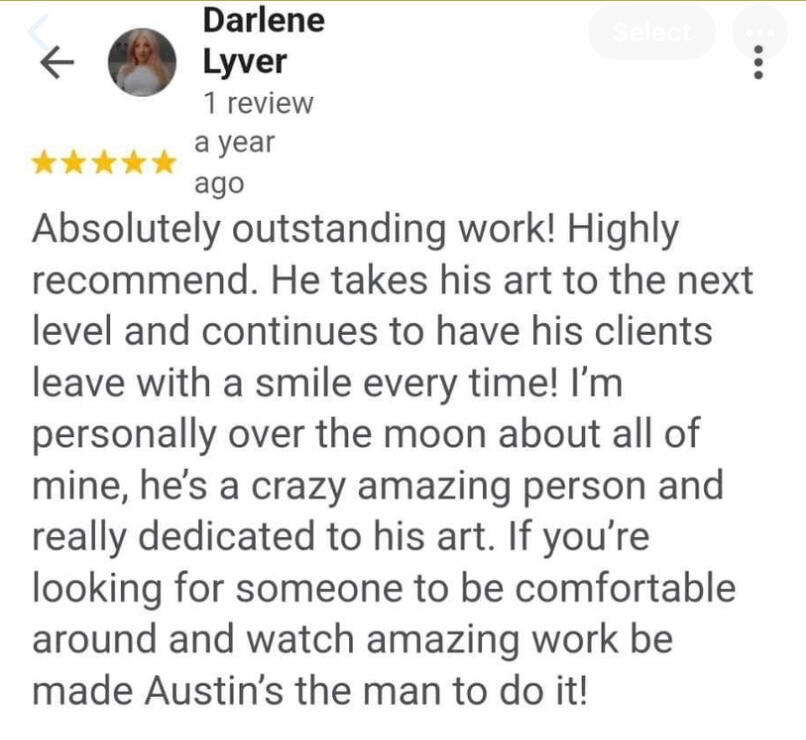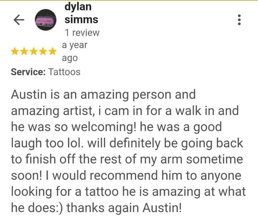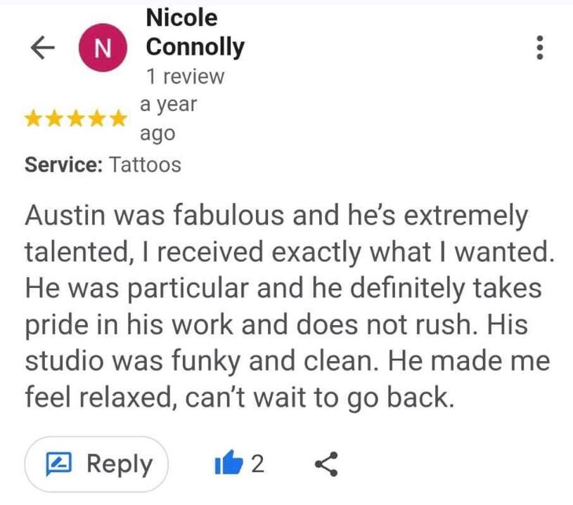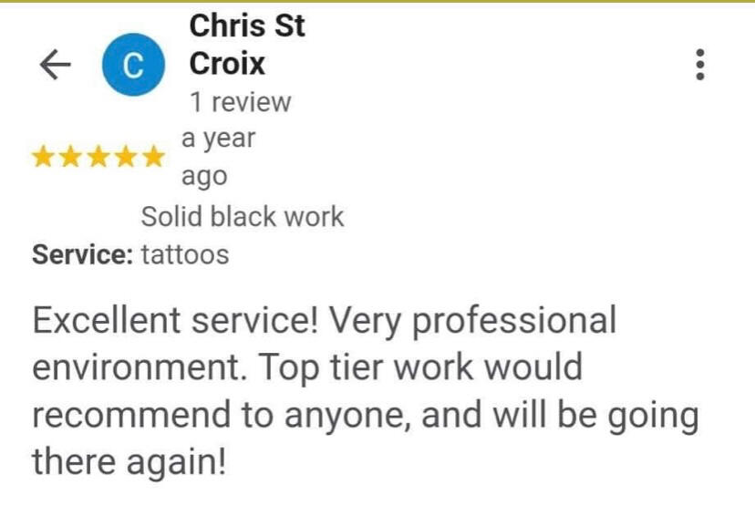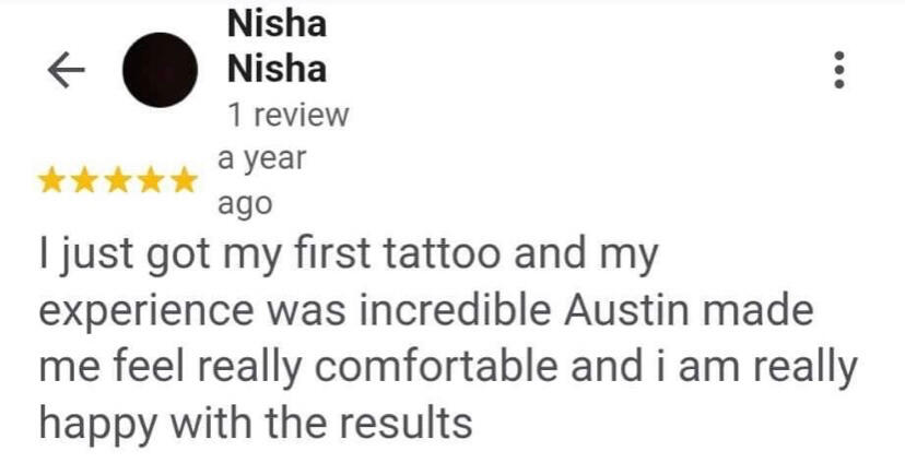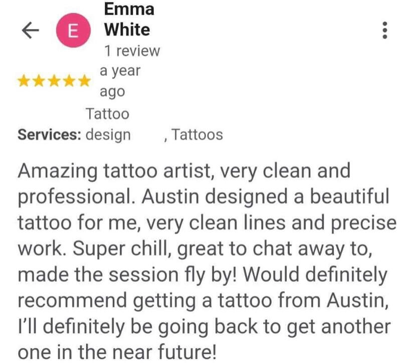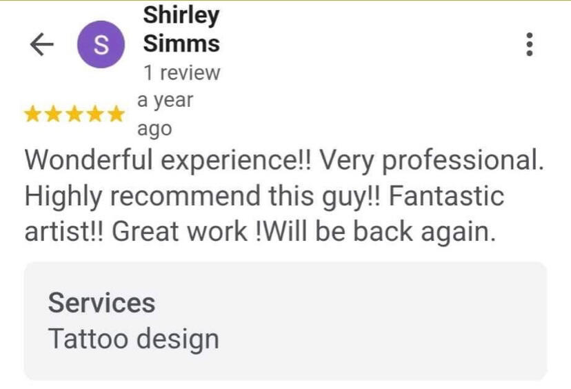 Curious about what it's like to get inked by us? Hear directly from our clients! Our community of satisfied customers shares their experiences and stories, showcasing the artistry, professionalism, and dedication that define our work. From first-timers to tattoo enthusiasts, our clients' reviews reflect the passion and care we pour into every tattoo. Read on to discover why our clients keep coming back and why you'll love your next tattoo with us!Check out the button below to send in a review!